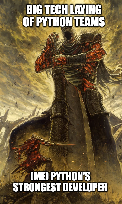 So funny seeing everyone reacting to the python layoffs from google. Which made everyone scared to use it but not me. I have and will always be python’s strongest warriror